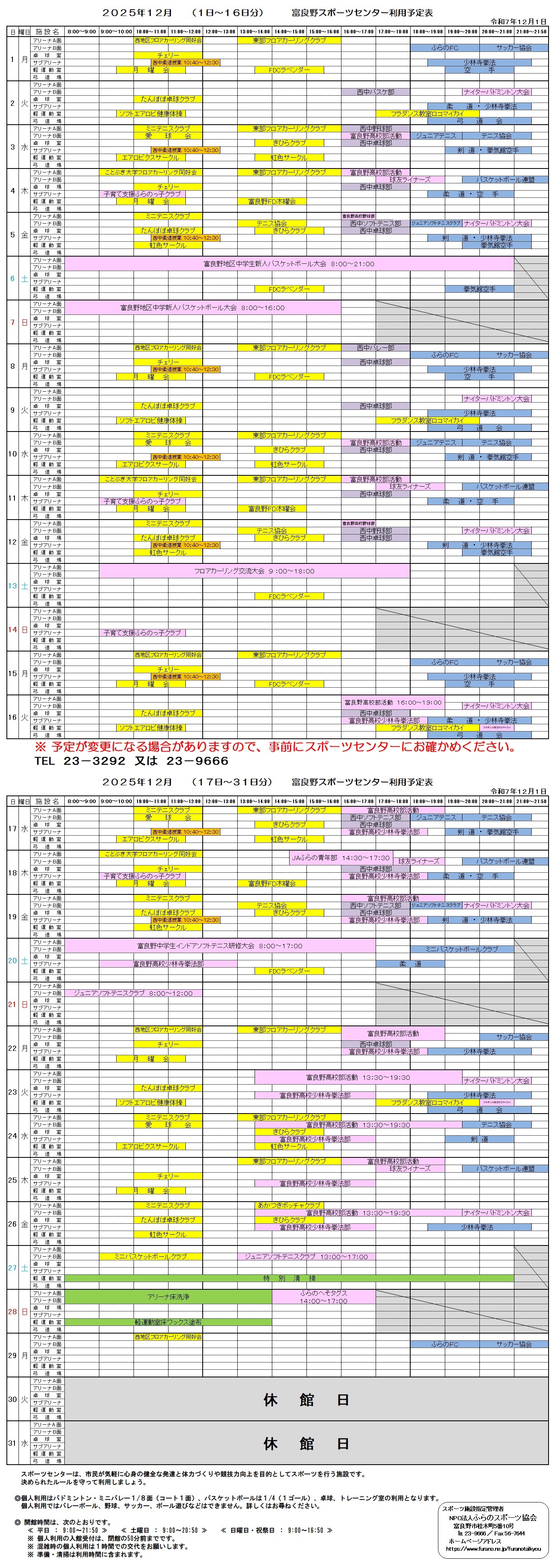 ※利用予定表は変更が出る場合がありますので再度ご確認の上ご利用下さい。