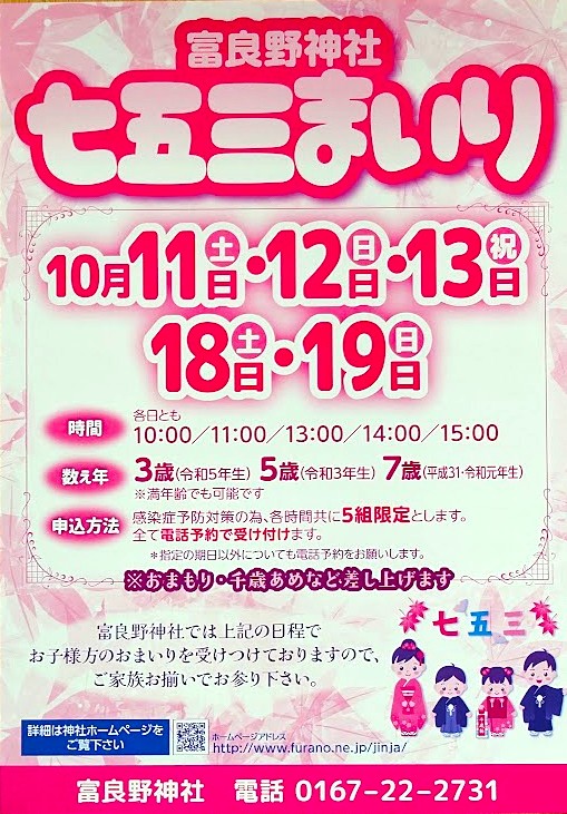 富良野神社では 10月11(土)、12日(日)、13日(祝)、18日(土)、19日(日) 各日 10:00 11:00 13:00 14:00 15:00 の5回、御社殿で 七五三祝祈祷を致しますので、電話(☎0167-22-2731) にてご予約の上、ご家族お揃いでお参り下さい。 尚、引き続き感染症対策で1回5組までと致します。