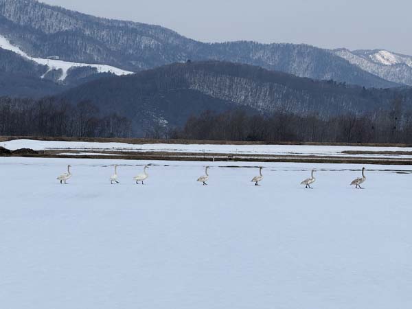 ワイワイ日記を調べたら、昨年は3月18日にハクチョウを紹介している。 毎年、今時期に紹介しているようだ。 今朝、自宅の玄関を出た時に、ハクチョウの鳴き声が聞こえたので、「ハクチョウの時期か!」と思った。 勘違いかもしれないが、ハクチョウがいそうな畑に向かった。 今朝はレストランの掃除をしなくても良いので、時間に余裕があった。一昨日と昨日はレストランは定休日だったが、一昨日の朝に掃除はしておいた。 案の定、ハクチョウは集団で空を飛んでいた。少し車を走らせハクチョウいる畑に着いた。 写真を撮っていたら、どういう訳か一列に“隊列”を組んで歩き出した。 ハクチョウを解説します。